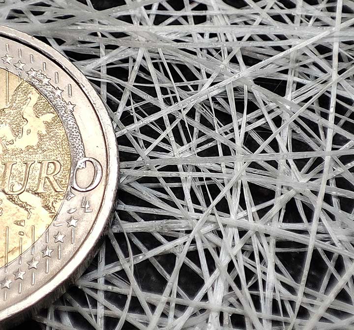 Die fiberglass-Matte "SILVER" zur Verstärkung von Ausgleichs- und Spachtelmassen besteht aus 50-75mm langen Natriumzirkonsilicatfasern, einem AR-Glas gemäß DIN EN 1259-1.